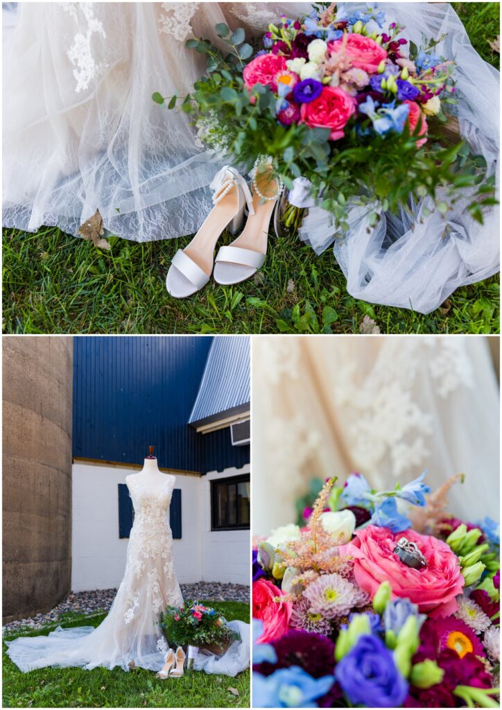 I found our lovely bride to be in the ground floor bridal suite. The girsl were finishing up hair and make up when I arrived. One of the movely bridesmaids helped me take the dress outside and place it on the dress form. She also got in touch with the boys to make sure they weren’t going to drive up on spot it. Jamie chose a layered lace dress that fit the vibe of her day perfectly. The flowers by Premier Petals were stunning. A vivd pop of color for a fall day.