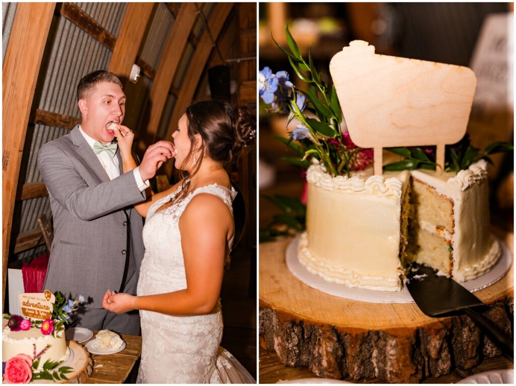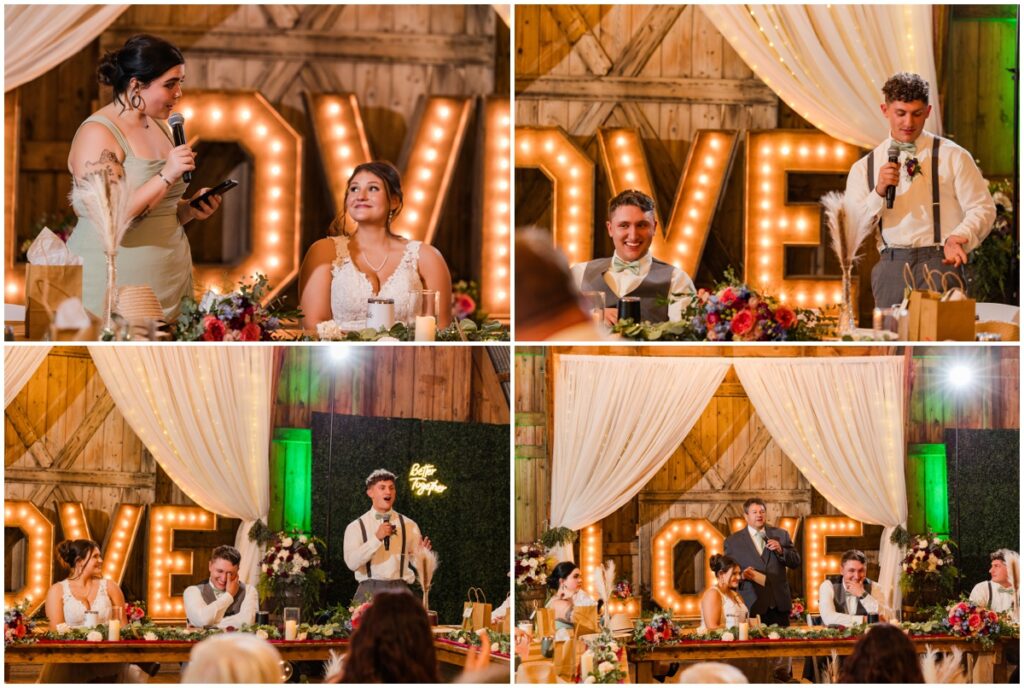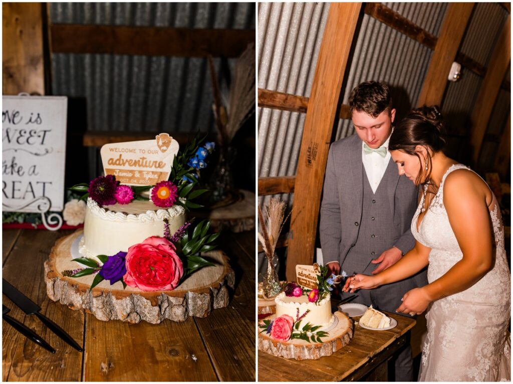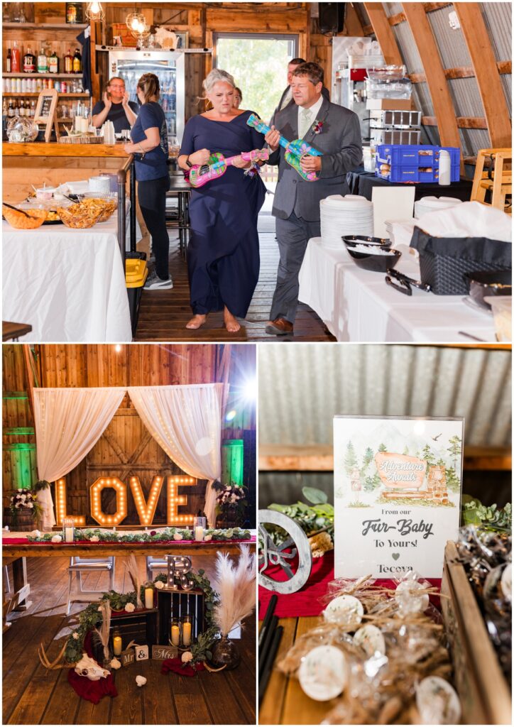 Poplar Creek is an event barn I had yet to have the honor of photographing. It is quite pretty on the outside but you never know what you’re going to find when you walk in. This one is a beaut Clark! The long space with the large arched roof lines brings all the attention to the couple’s head table. Jamie’s choices in decorations were gorgeous and the details made the day. They have real wooden tables for dinner and when they were pushed together in large rectangles it added an elegance that you just don’t get in most rustic spaces. Jamie and Tyler love to visit the National Parks our country has to offer and each table was named after one.