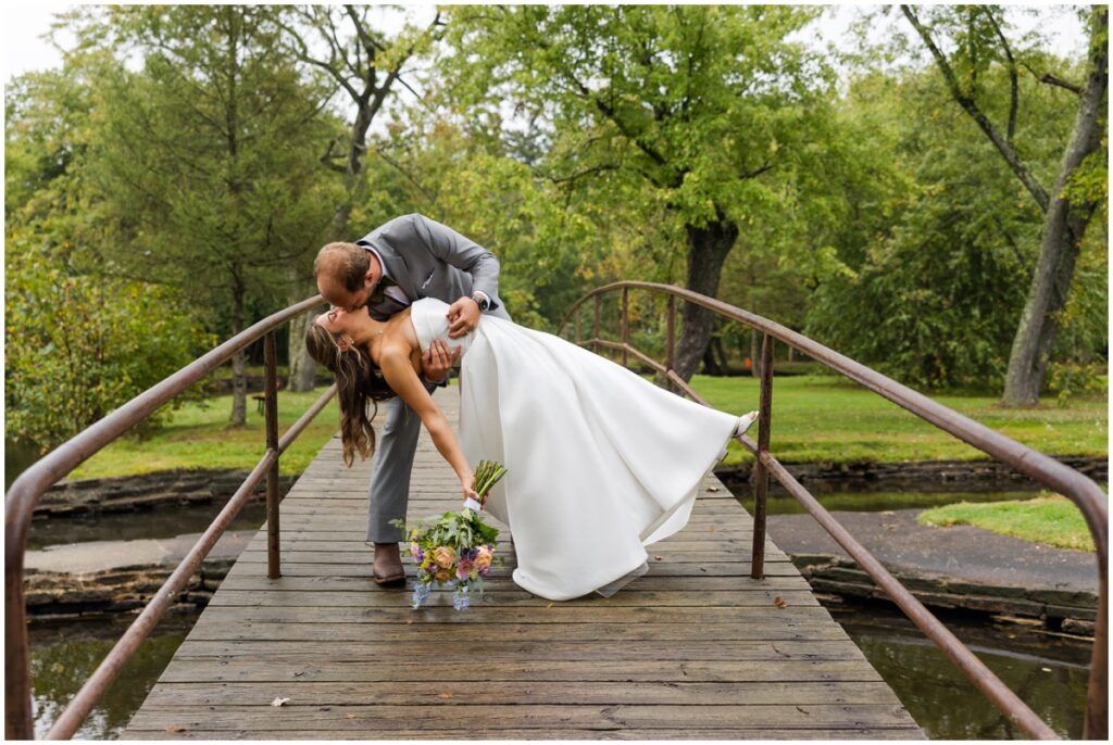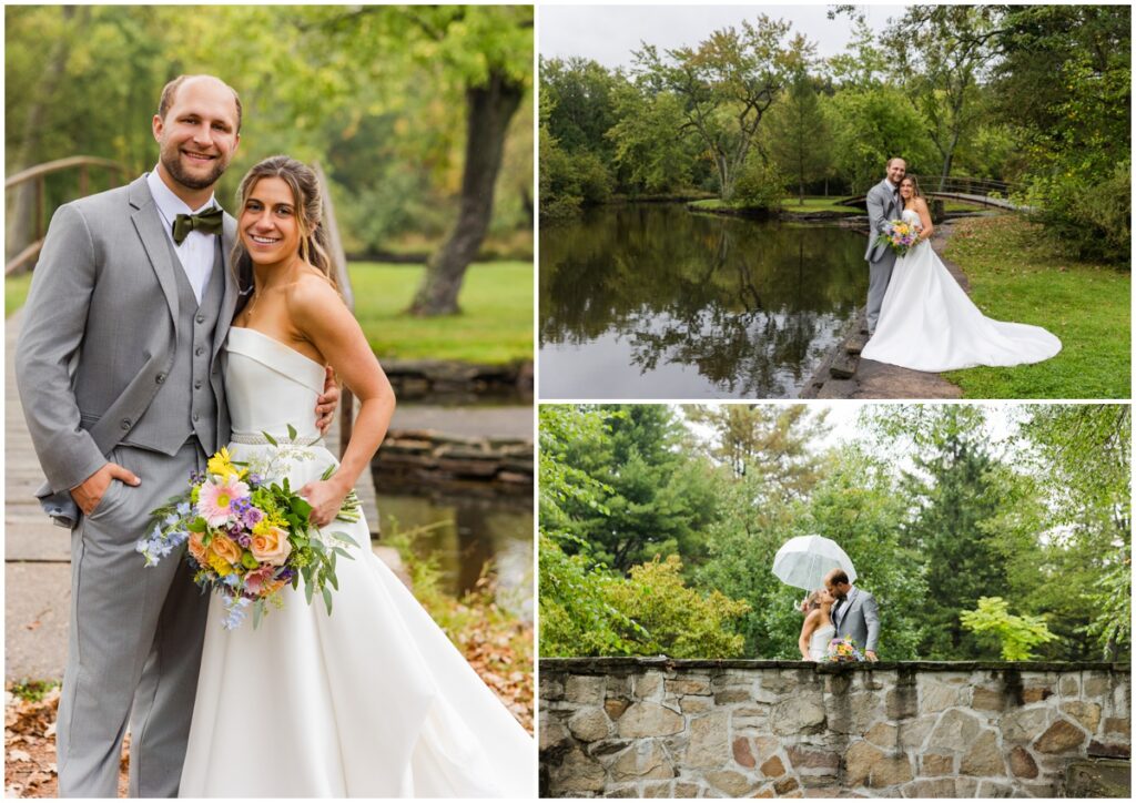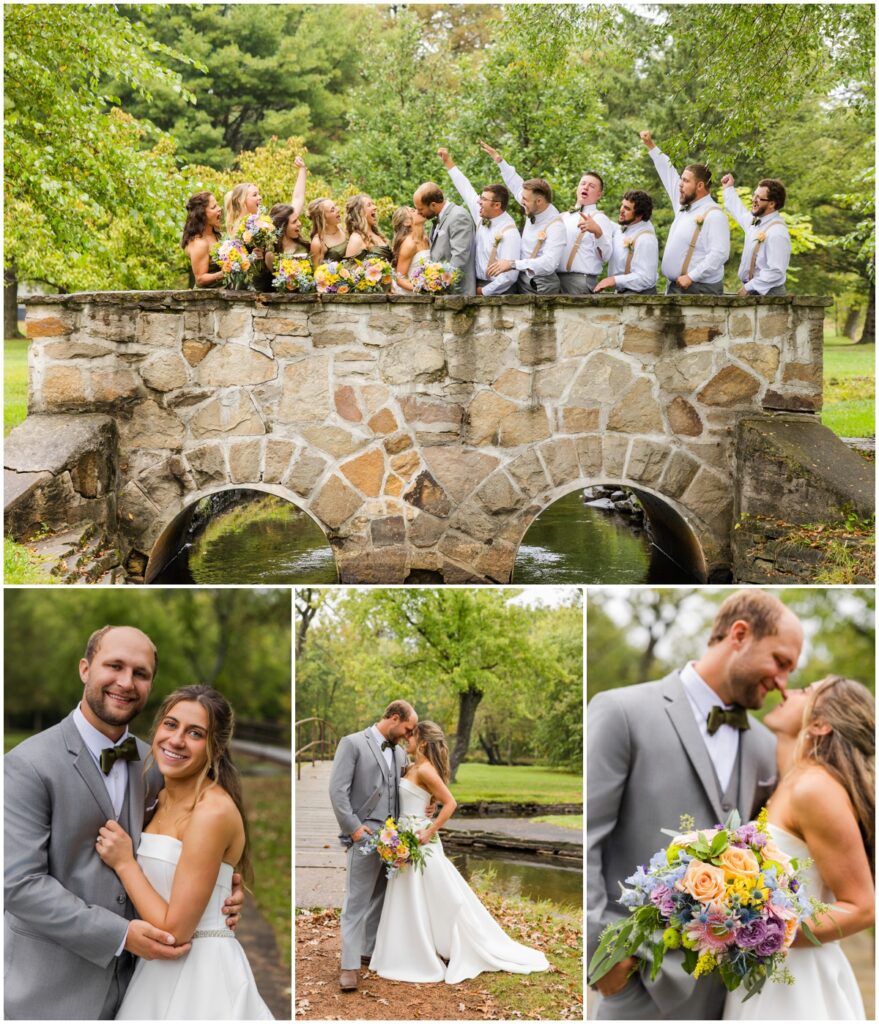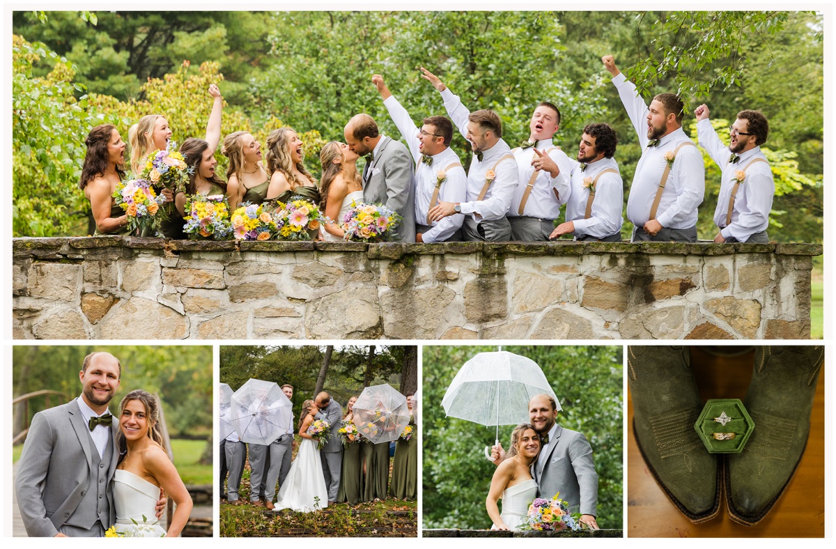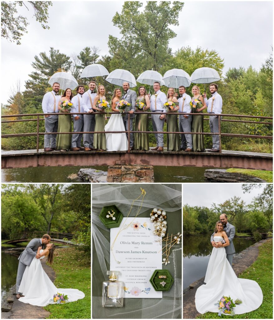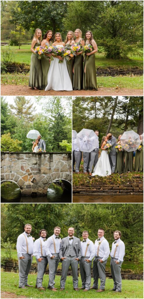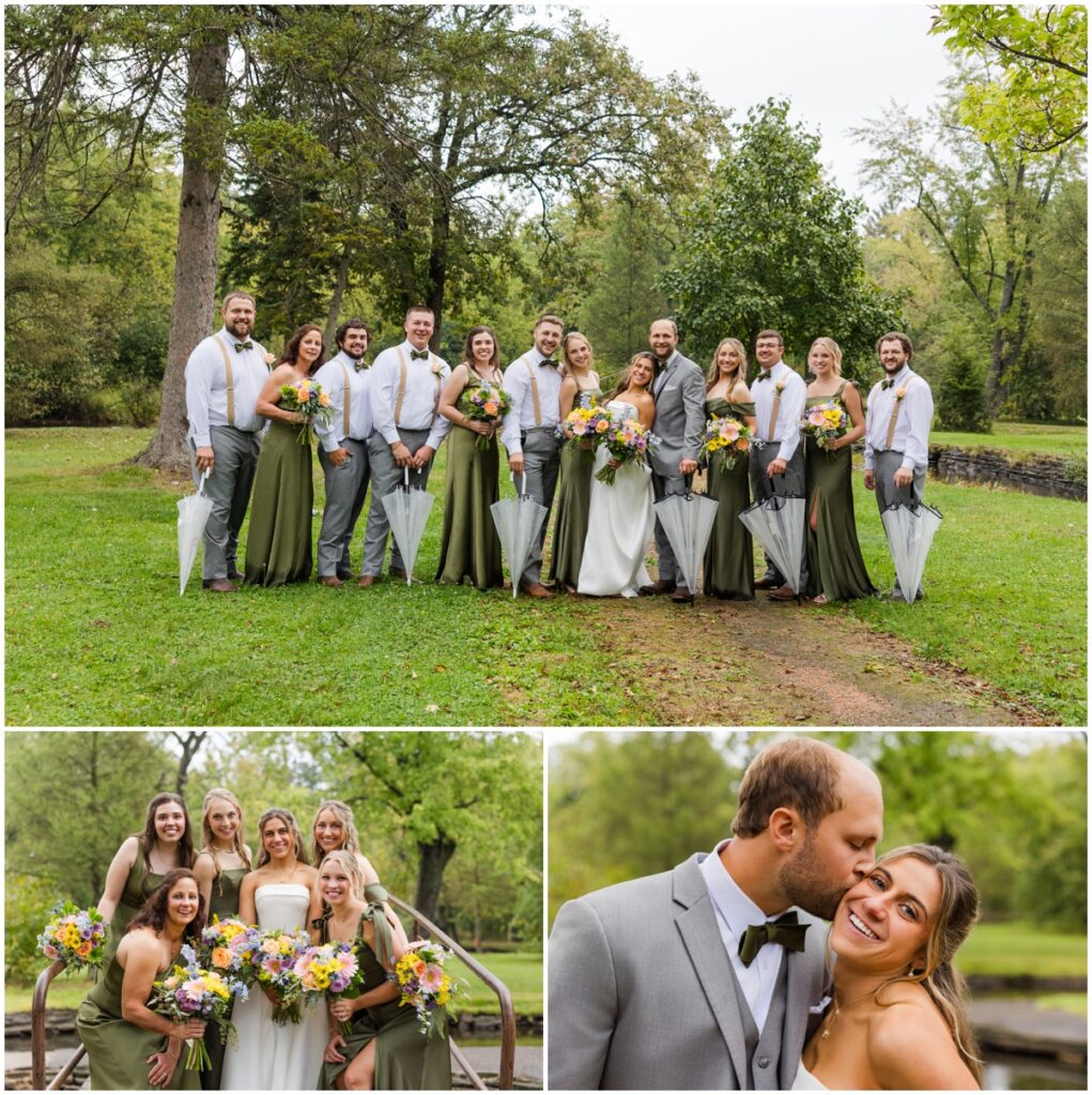 Then it was time to head to the reception but the party bus had to stop for photos first. It rained the whole way from Waupaca to Iverson Park. After being there a few minutes the rain let up and this wedding party was on it. We grabbed the umbrellas and the drinks and headed out into the soaking wet grass. Not one worry or complaint out of this whole group. The bottoms of dresses were soaked. They didn’t care. The shoes were sopping wet. No worries, they all had boots to change into. There were still some sprinkles falling and full size droplets coming from the trees. Eh, it’s just water.
