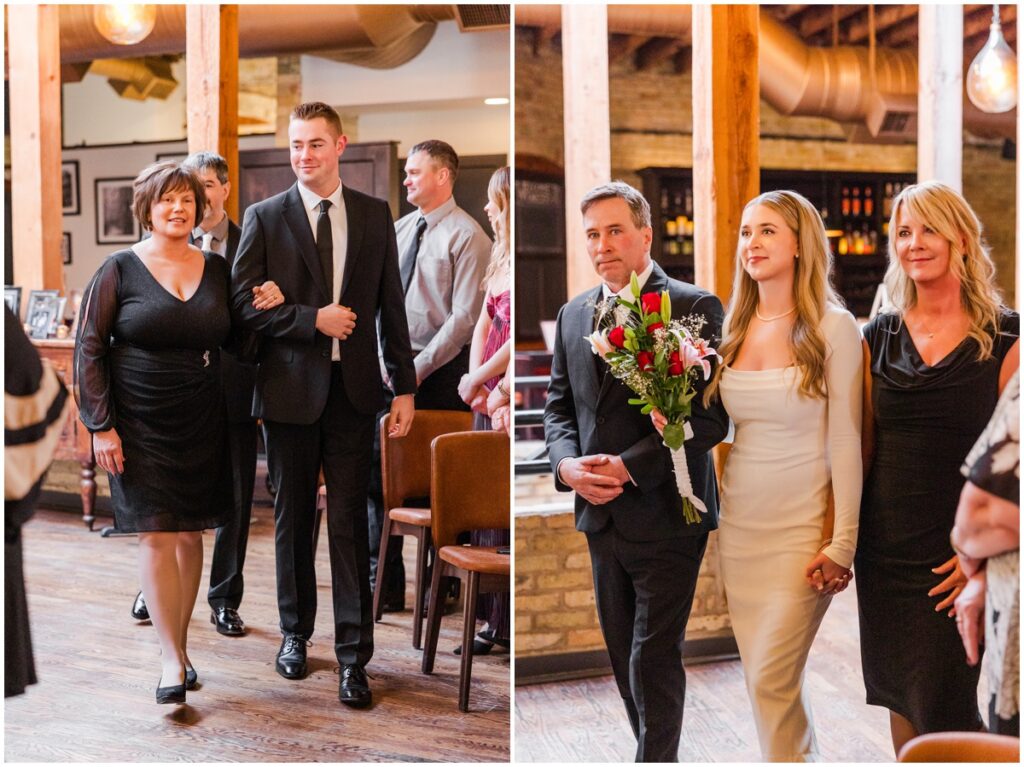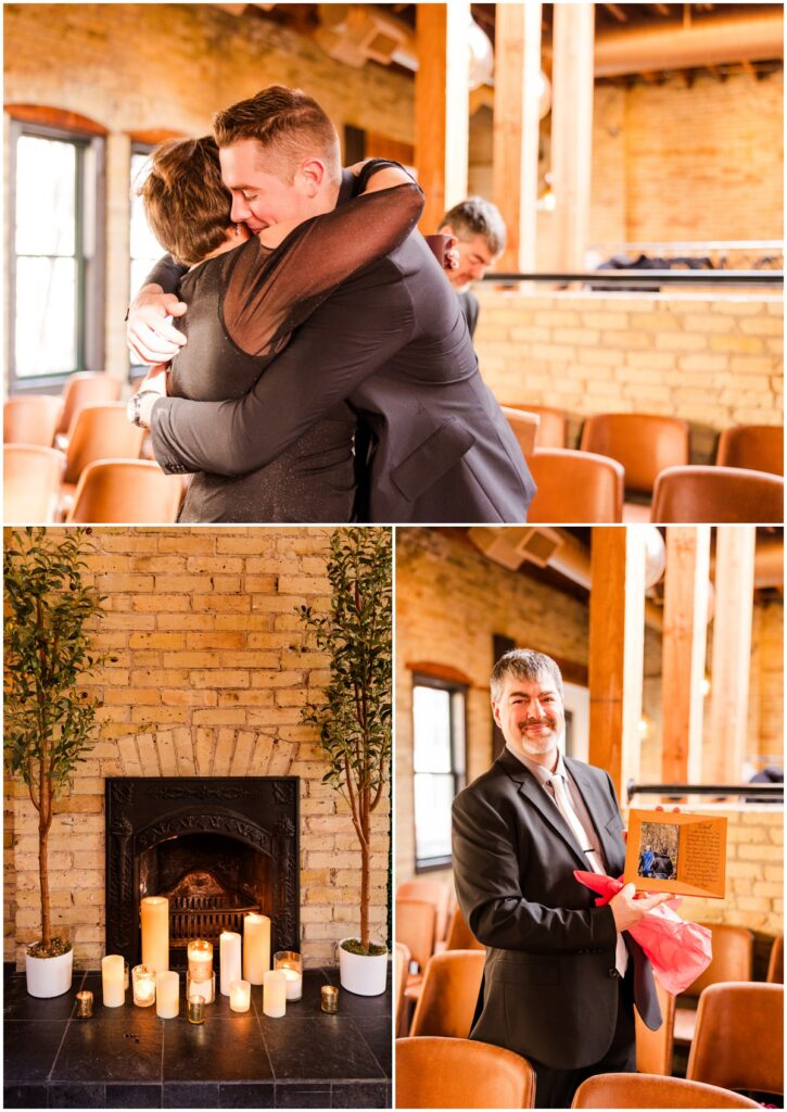 It was a winter wedding but a warm day in Milwaukee with the ice breaking up on the river and the snow piles melting away where the sun could reach them. The Third Ward was packed with people taking advantage of the spring like weather. Onesto’s restaurant was overflowing with patrons on the main floor but the event space above was being prepared for a much more intimate experience. While the event coordinator was putting tables in place and Ashley was decorating with framed photos and simple final touches, Sidney and Bryce were preparing to commit to forever.